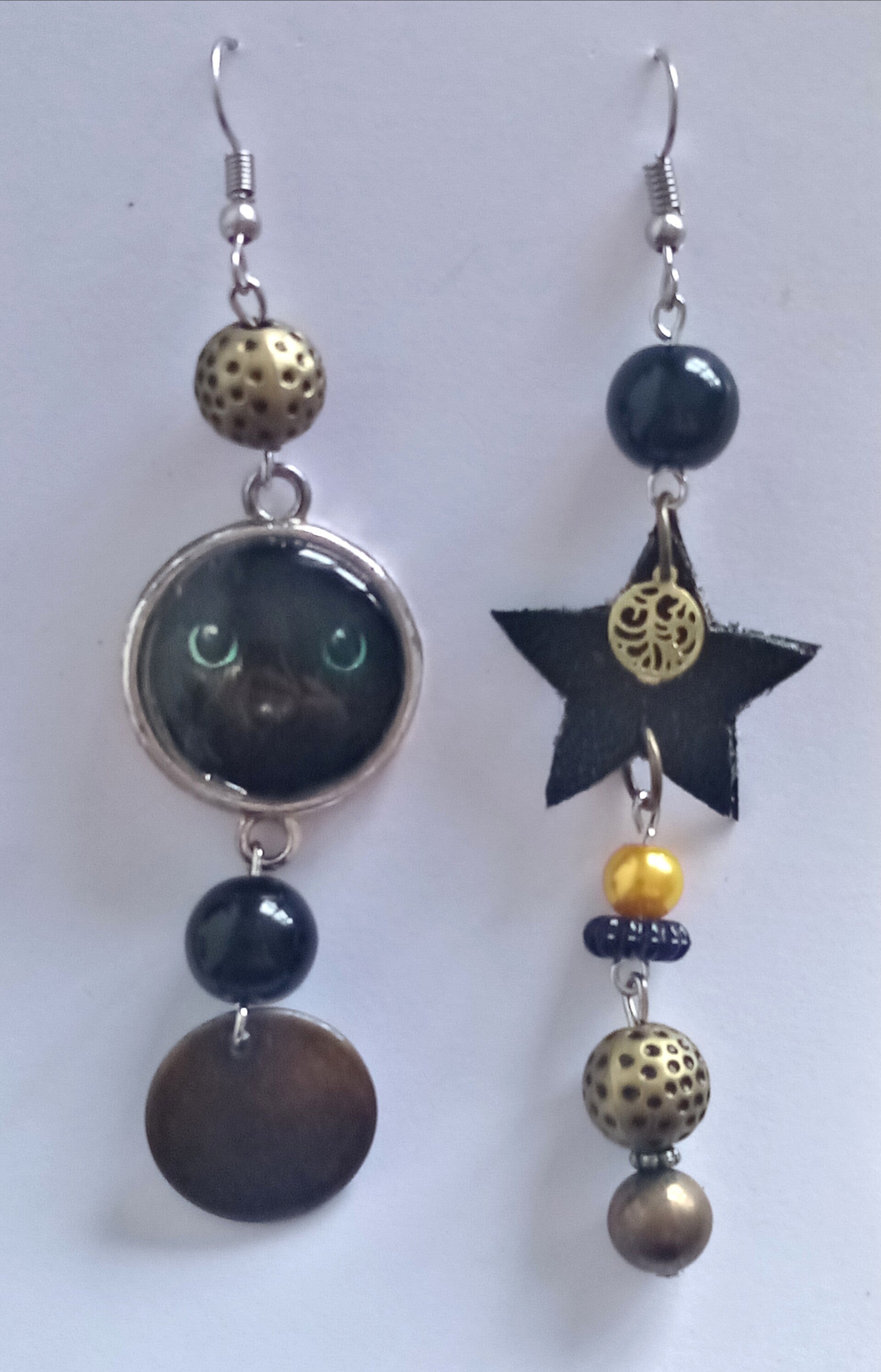 Attaches en acier inoxydable, perles en laiton et en acrylique, cabochon en verre, breloques en acier inoxydable et cuir.