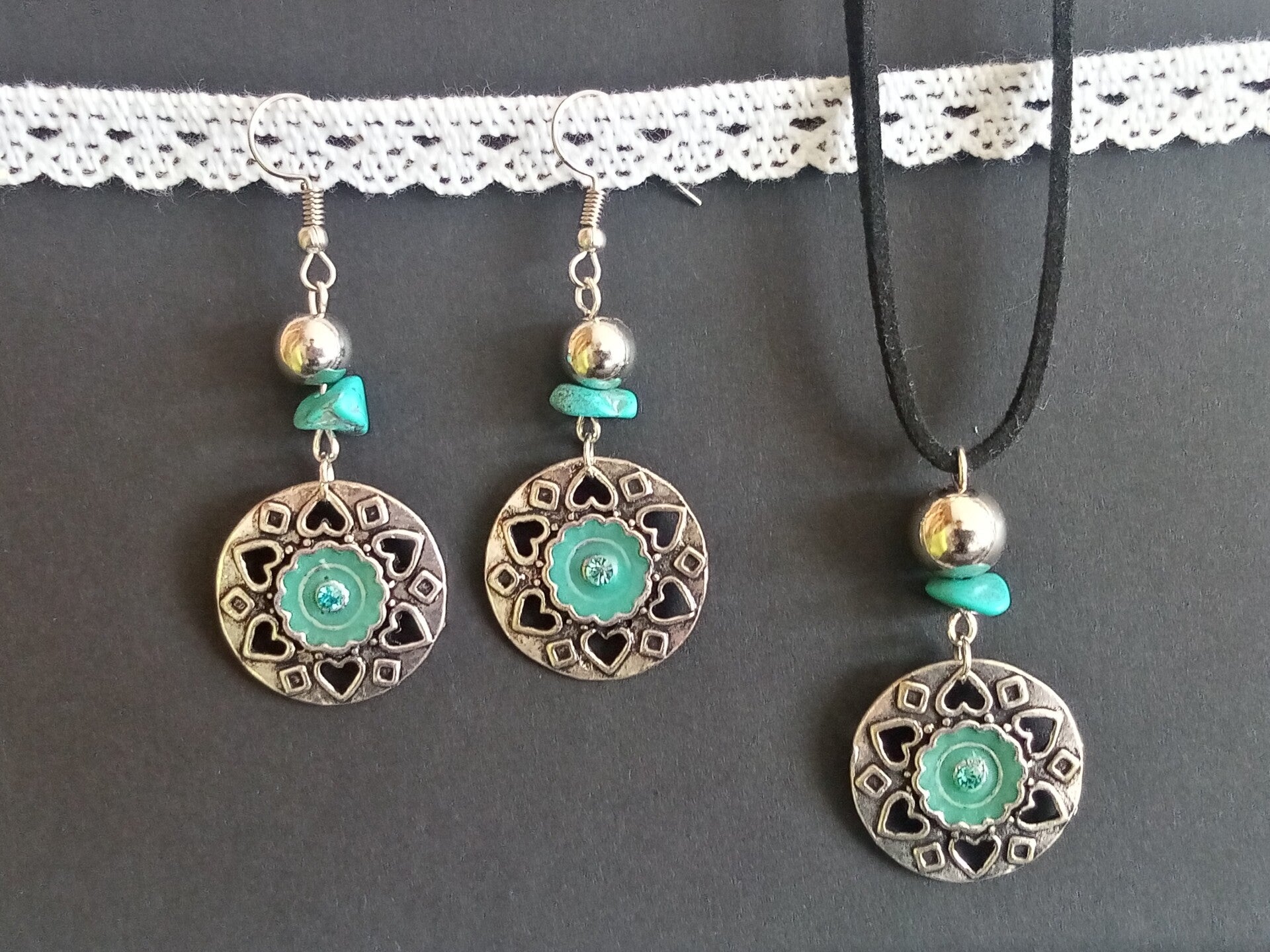 Parure assemblées à la main en modèle unique, composée d'une paire de boucles d'oreilles et d'un collier assorti