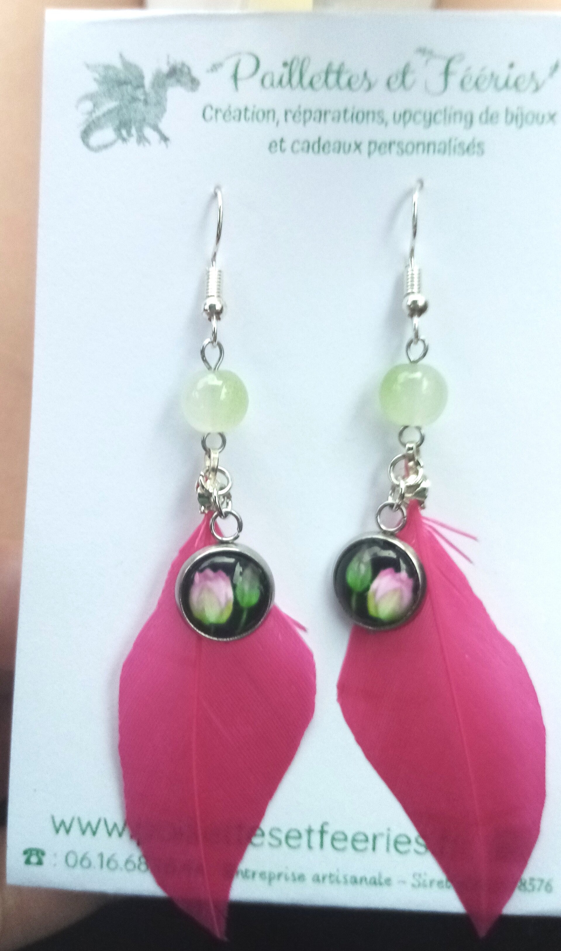 Boucles d'oreilles assemblées à la main en modèle unique, attaches en acier inoxydable, cabochon en verre, plumes synthétiques et perles en verre