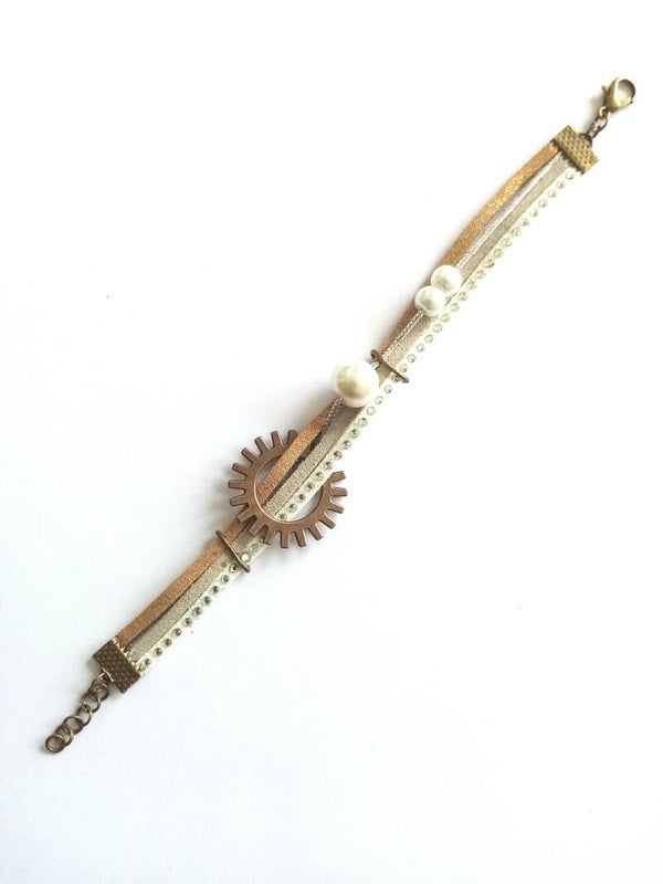 Bracelet en suédine, strass synthétiques, perles en acrylique et verre, breloques en laiton, fermoirs en acier inoxydable